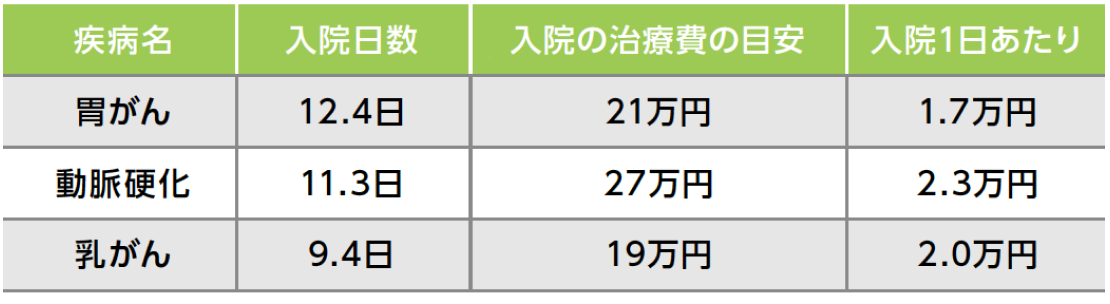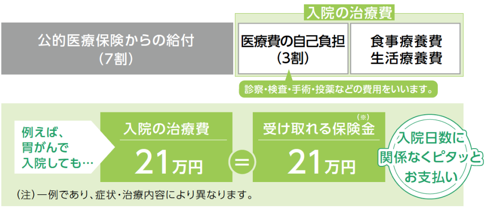 公的医療保険の対象となる入院であれば、がん、脳卒中、心筋こうそく、女性特有の疾病の場合でも補償対象となります。